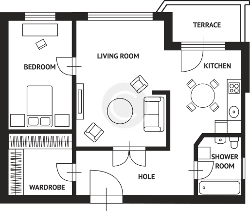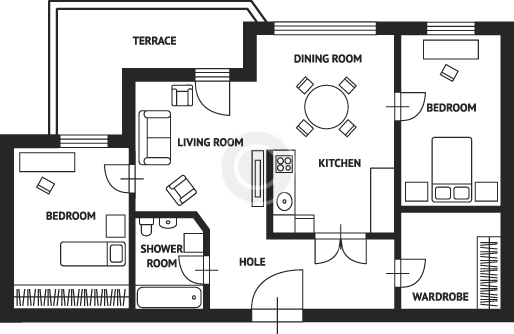 This apartaments in 809 square feet are with big kitchen, two bedrooms, one bathroom, also a terrace and a wardrobe.